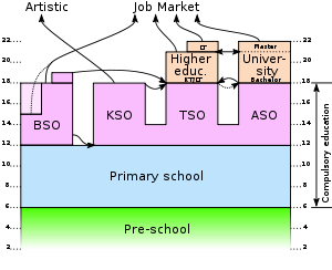 Tehát, aki elvégezte az általános iskolát 12 évesen, az a középfokú oktatás rendszerébe lép. Mehet szakmunkásképzőbe (BSO), művészeti szakközépiskolába (KSO), technikumba (TSO) vagy gimnáziumba (ASO).